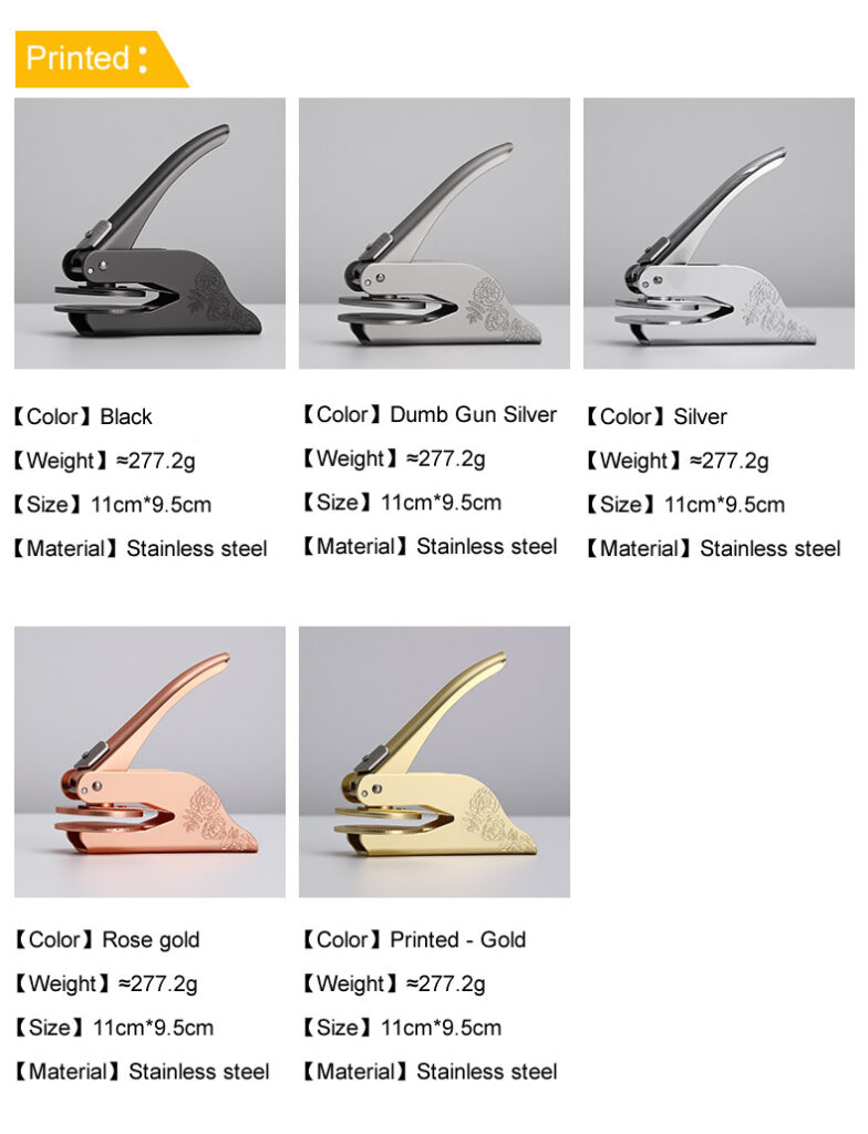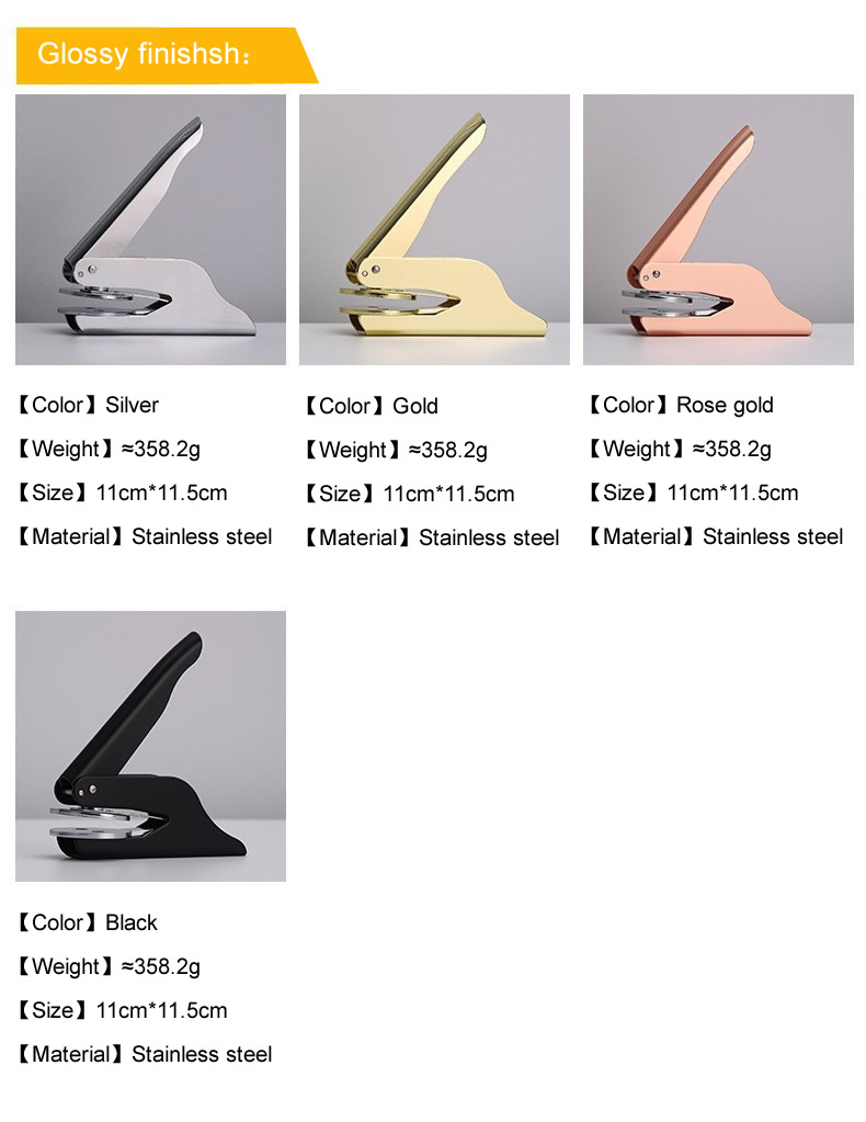 Customized logo manual pliers seal, single handle design for easy operation, suitable for 160g or 28g paper. It is made of high-quality metal materials to ensure durability and precision, making every signature clear and neat. Suitable for various office scenarios, supporting OEM customization services, creating exclusive seal solutions as needed, allowing the brand logo to be perfectly presented on documents.